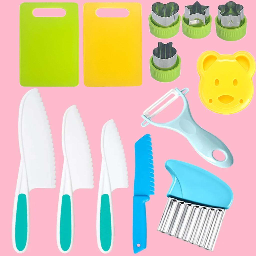 13pcs Montessori Kitchen Tools Cookware Toddlers Safe Knife Set for Real Cooking Kids Knife Cutting Boards Crinkle Cutter Peeler