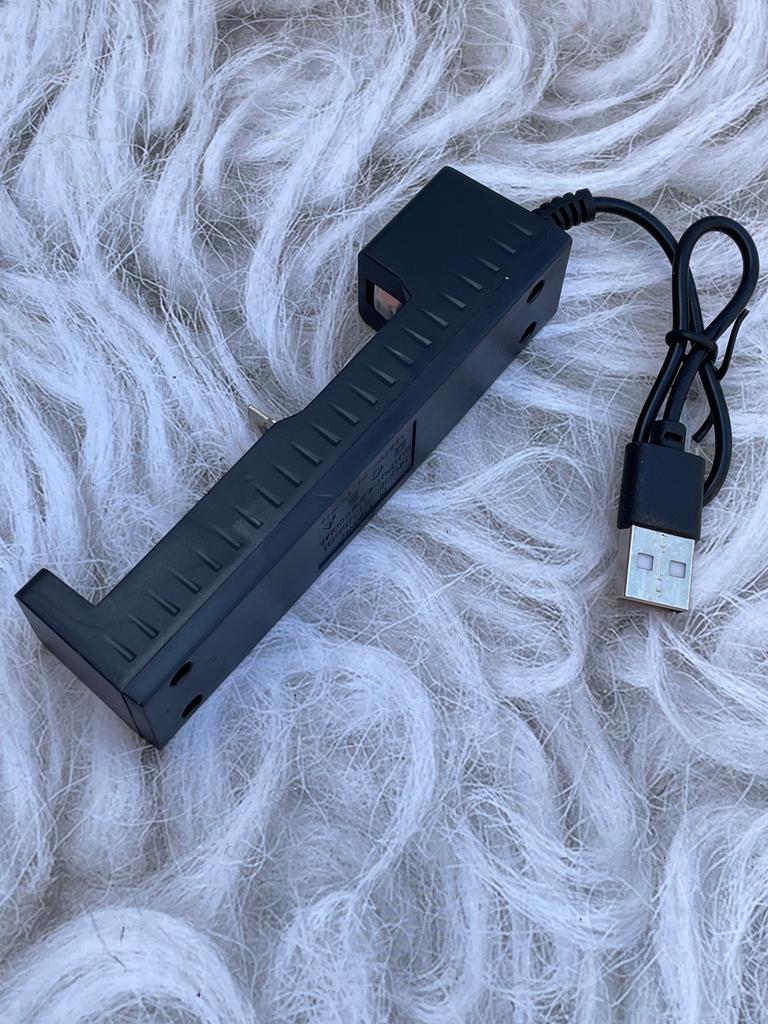 Portable, universal charger powered by a USB port, designed for charging cylindrical lithium-ion batteries outputting 3.7V with charging up to 4.2V. When installing batteries, it is necessary to observe polarity. Suitable for charging batteries of the following sizes: 18650, 18550, 18350, 16680, 16340, 14650, 14500, 10440, 21700, 26650. The charger is equipped with an indicator that shows the charging level. Red color is charging, green color is charging completed.