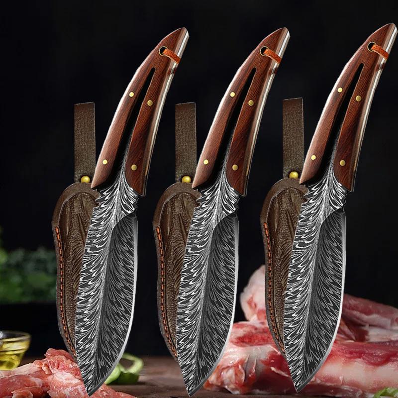 Kitchen Knife Butcher Boning Knife Feather Pattern Knife With Sheath Portable Stainless Steel Fruit Knives with Wooden Handle