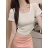 Summer New Solid Color Right Shoulder Exposed Collarbone Square Collar Short-sleeved T-shirt Simple Elastic Hem Curved Short Top