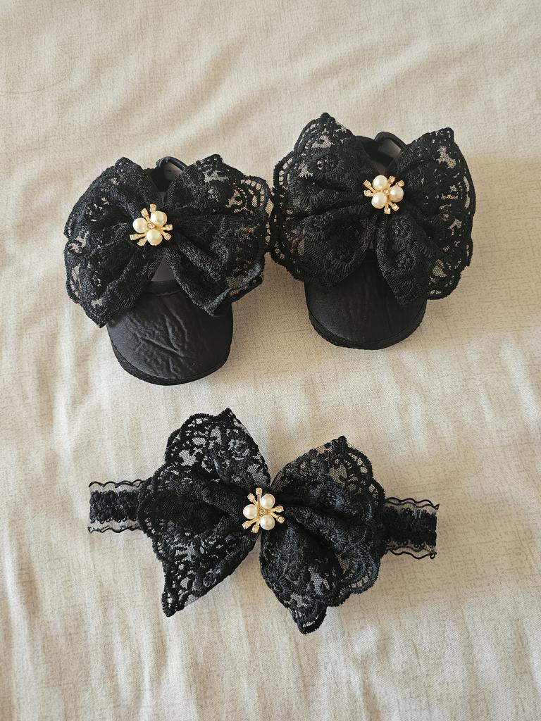 Baby Lace Pearl Shoes + Hairband Set Baby Toddler Shoes Soft Sole Big Bow Dot Rubber Shoes