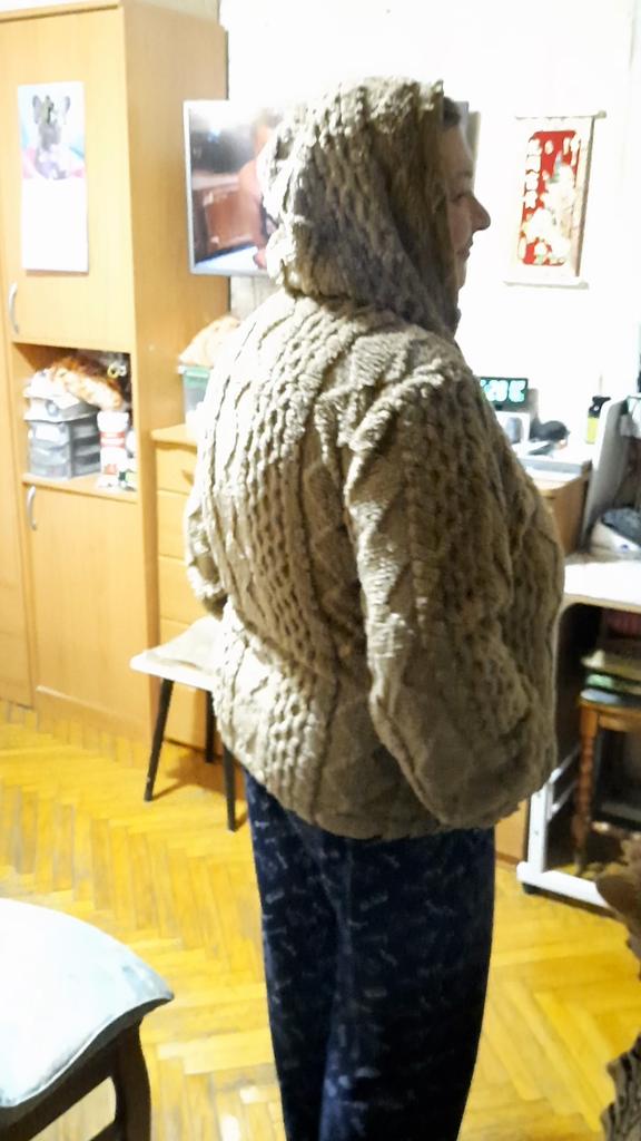 Fit for 48-50, warm, soft, cozy sweater, the color is not quite mine, I would need something brighter