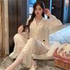 Light Luxury Ice Silk Pajamas Women's Autumn and Winter Ice Silk Sweet Wave Dot Lace V-Neck Cardigan Long Sleeve Home Clothes