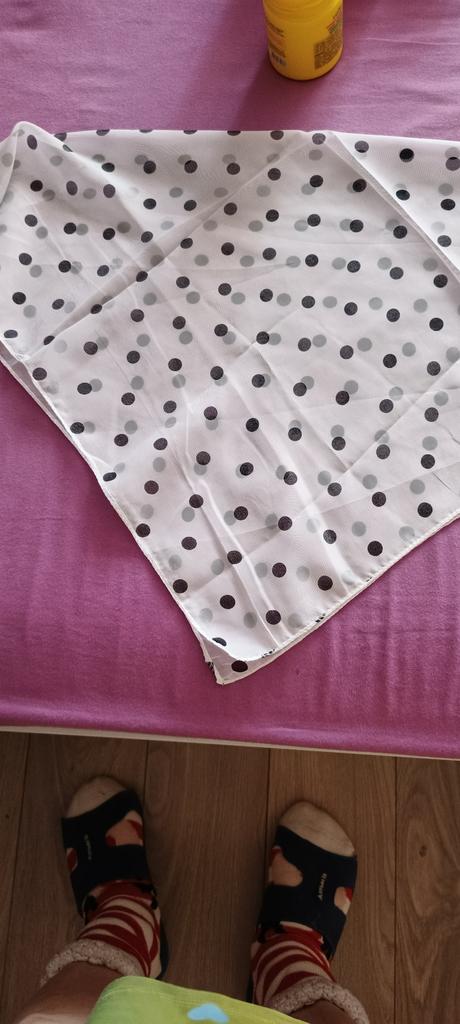 Good, but a small handkerchief,. I ordered black with white polka dots, but the polka dots are not very white, rather beige.