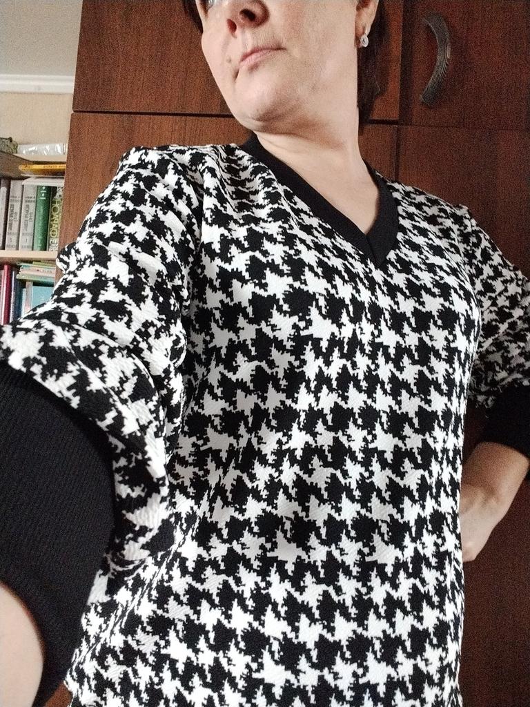 I like the color scheme, the neckline on the blouse. The top is quite light. and it would have been possible to order one size smaller for a 44-46 size