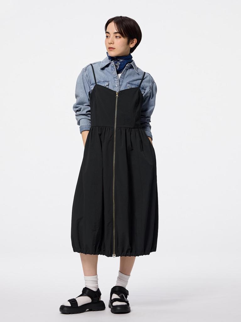 The GU by Uniqlo Front Zipper Bubble Hem Dress features a front zipper detail and adjustable shoulder straps. The skirt part has a bubble silhouette with a rubber hem that allows for adjustable slit depth, enabling various styling options. With its cooling contact feature, this dress provides a refreshing feeling upon wearing, and it uses recycled materials, considering the environment.