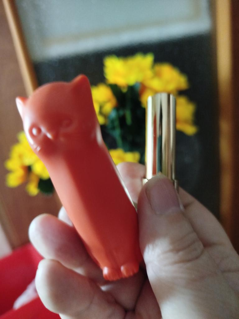 Moderately oily, softens lips well. The smell is very tasty - strawberry. The lip balm is colorless. And the case is a cat lover's dream. :) I also took black and white cats as a gift.