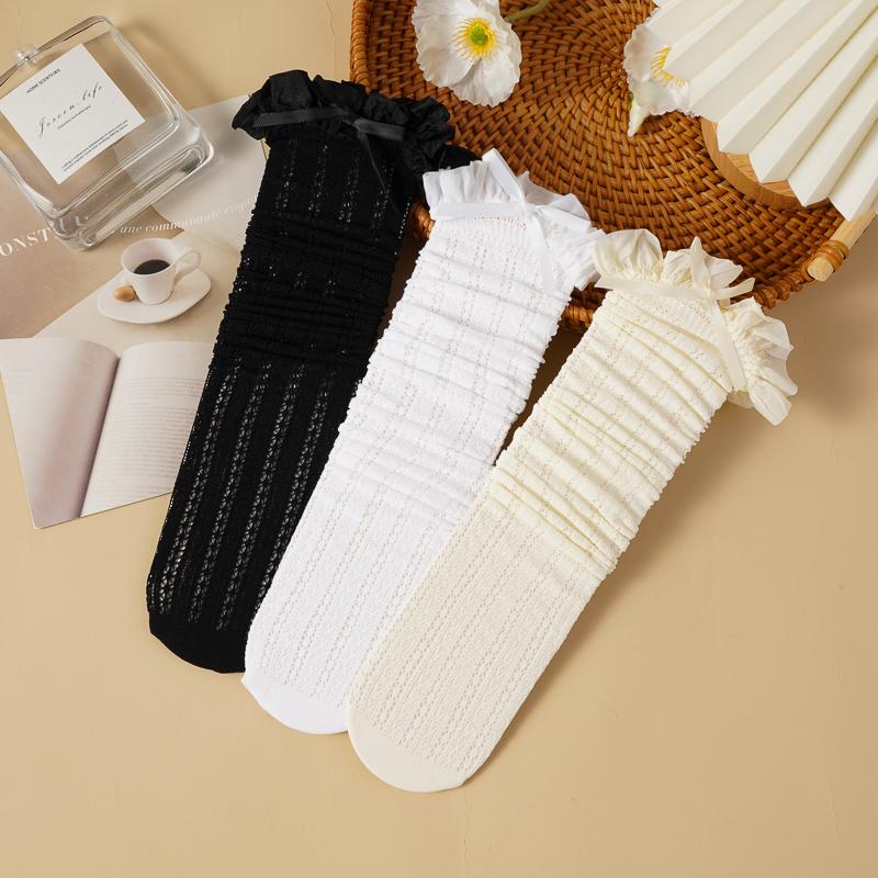 Sweet Girls Japanese Style Long-tube Socks JK Bow Ruffled Knee Socks Women Hollow Out Mesh Fishnet Socks