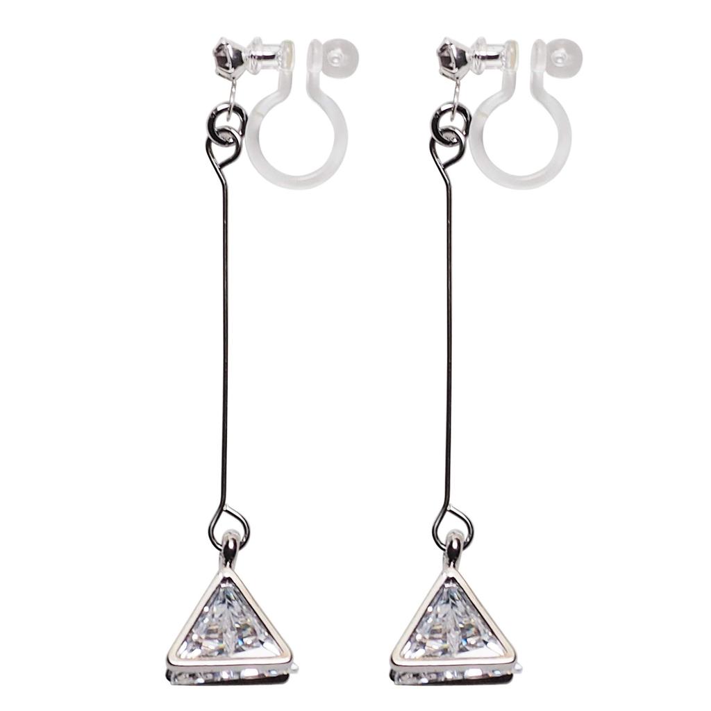 [Product Description] Non-pierced earrings with a single cubic zirconia diamond set in a triangular frame. The bold cubic zirconia shines around your ears, creating a luxurious atmosphere. The simple design makes these earrings suitable for all occasions, such as going out, the office, dates, girls' nights out, and dinner parties. Add these earrings to your wardrobe to create a beautiful look from every angle.