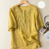 Short Sleeved 2025 Summer Art Retro Loose Design Embroidered Round Neck Thin Cotton and Hemp Women's Top
