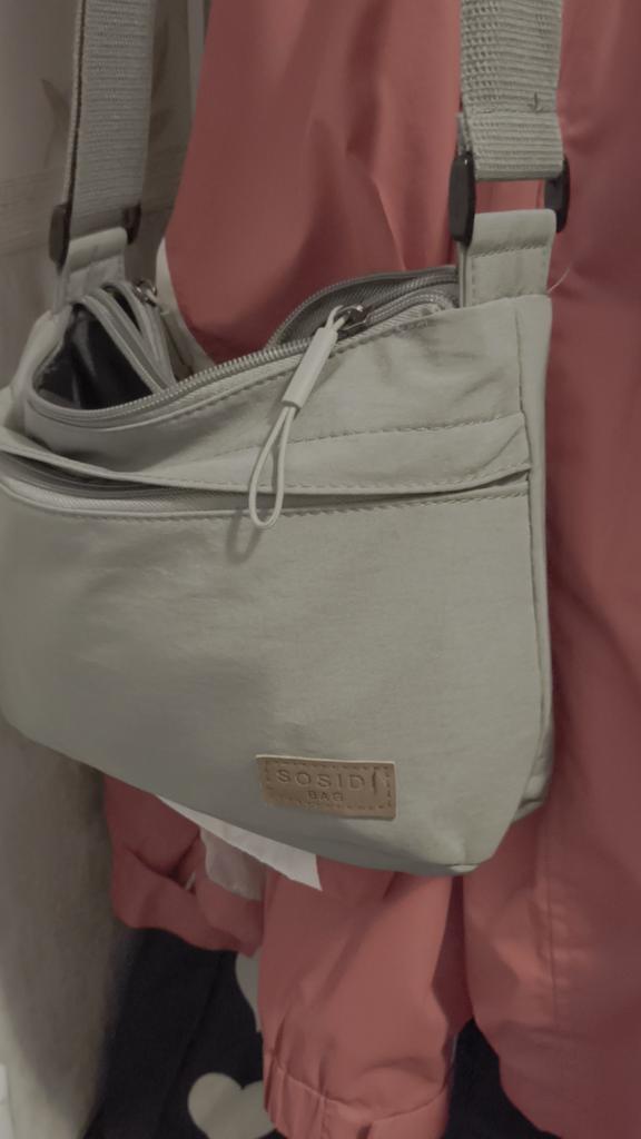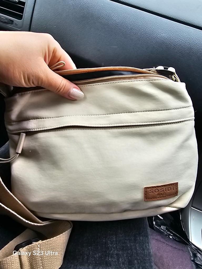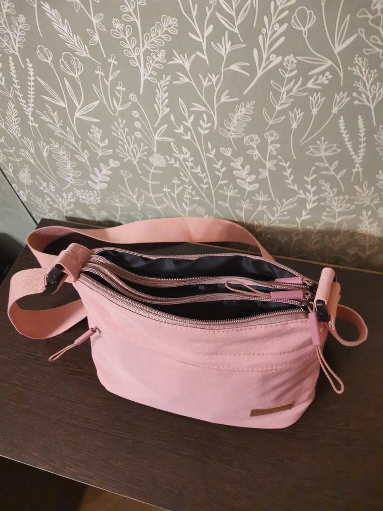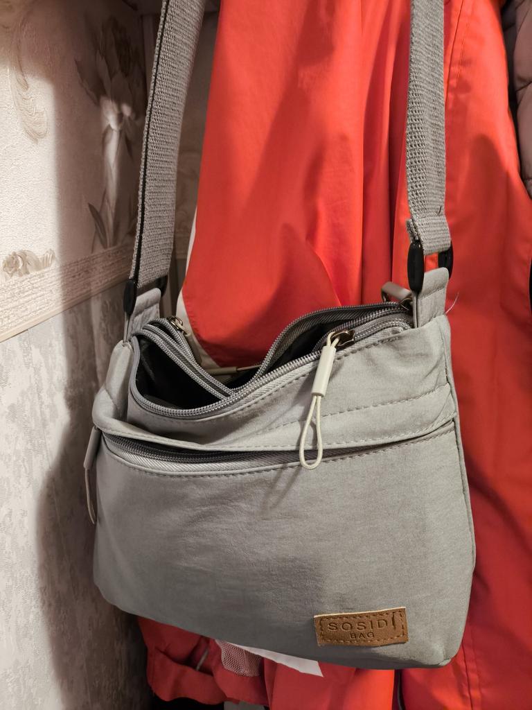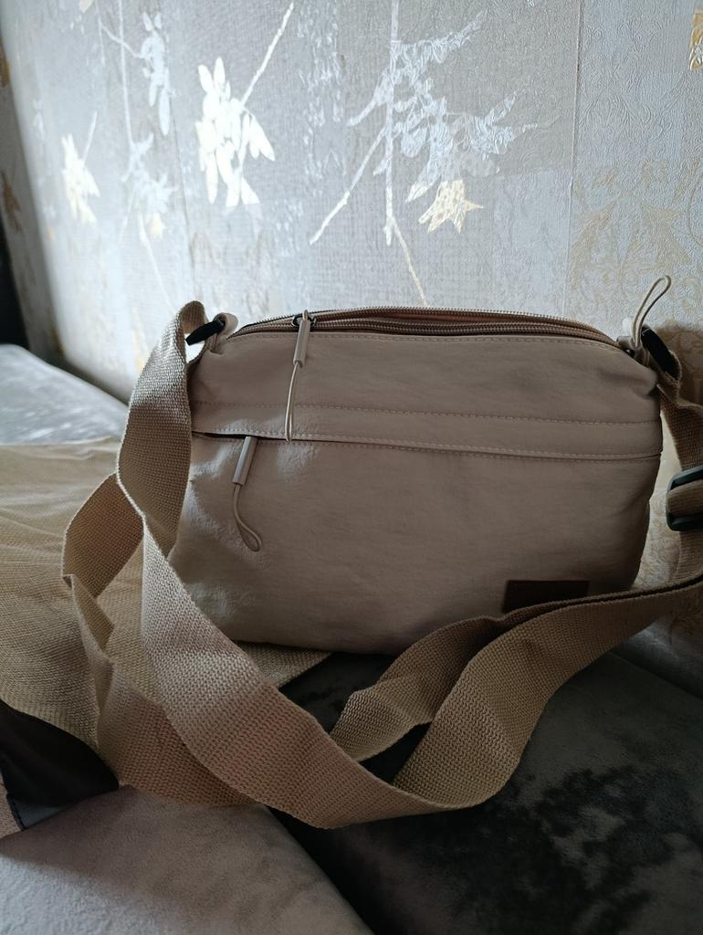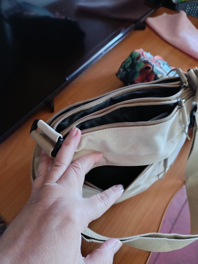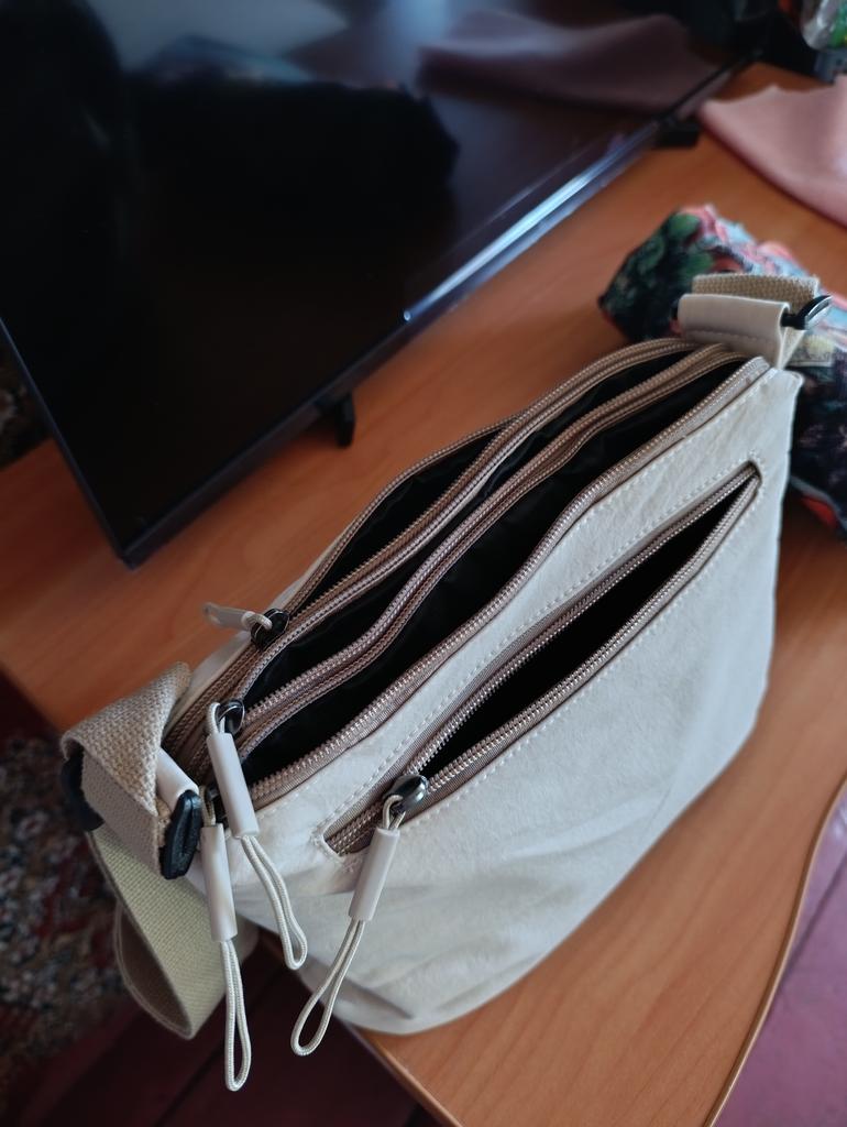 The bag is bombastic, has three large zippered pockets, two side pockets, one small zippered pocket inside the middle compartment, the color is pleasant, the fabric is not easily soiled, the strap is adjustable, I will order more in other colors, the price is pleasant, the seller as a thank you put stud earrings as a gift, very nice