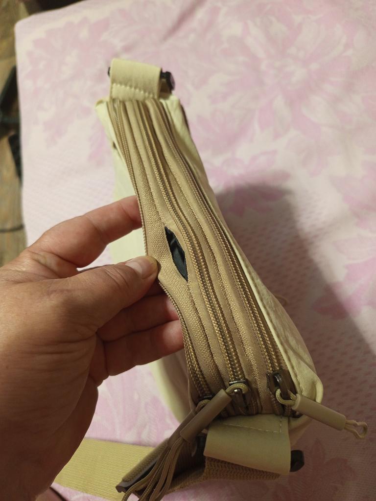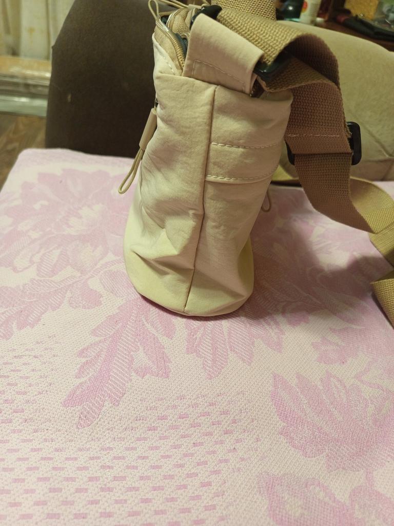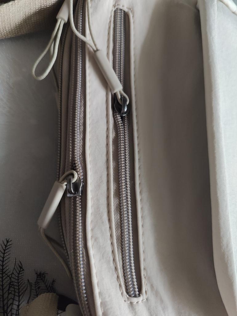 The beige raincoat bag is sewn neatly, looks good, very light, 5 compartments with zippers, neat fittings without pretentiousness, I took it for summer walks, it will fit a 0.5L bottle of water and so on.