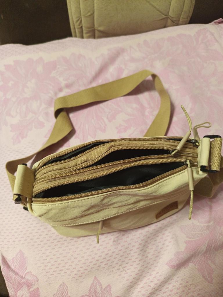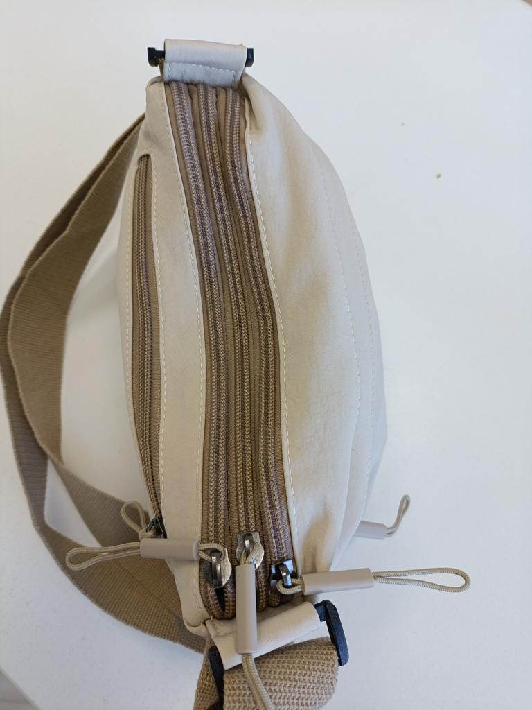 TEXTILE BAG WITH FIVE COMPARTMENTS The compartments are closed with a zipper The belt is adjustable Convenient for travel