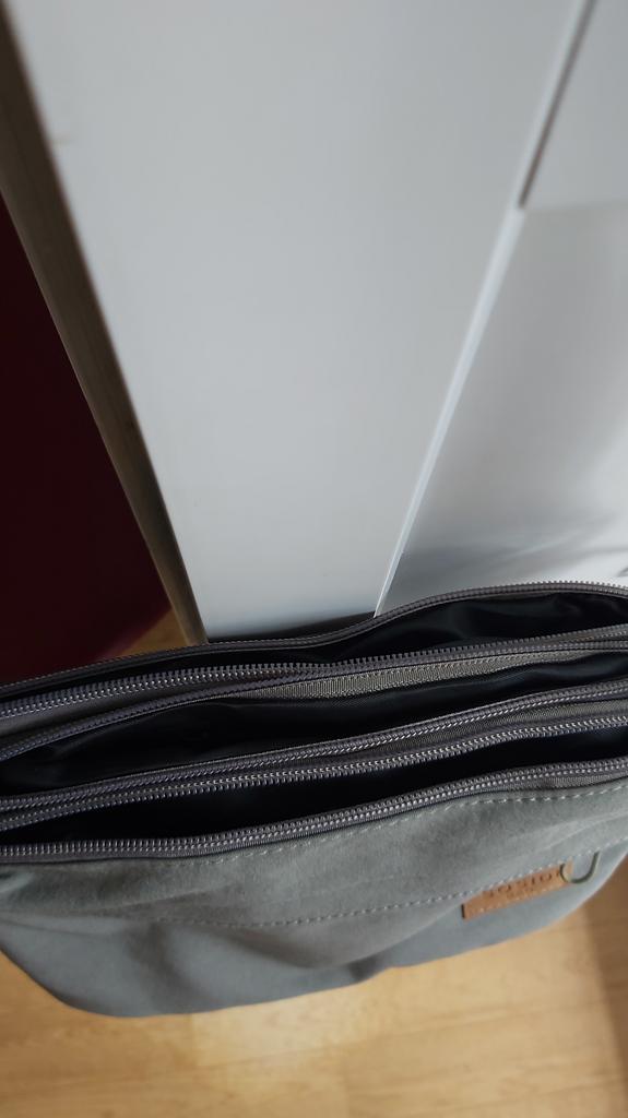 The bag is good, the zippers work properly, the threads don't stick out. Textile, lightweight, modern. Three compartments inside and two zippered pockets outside. Recommend