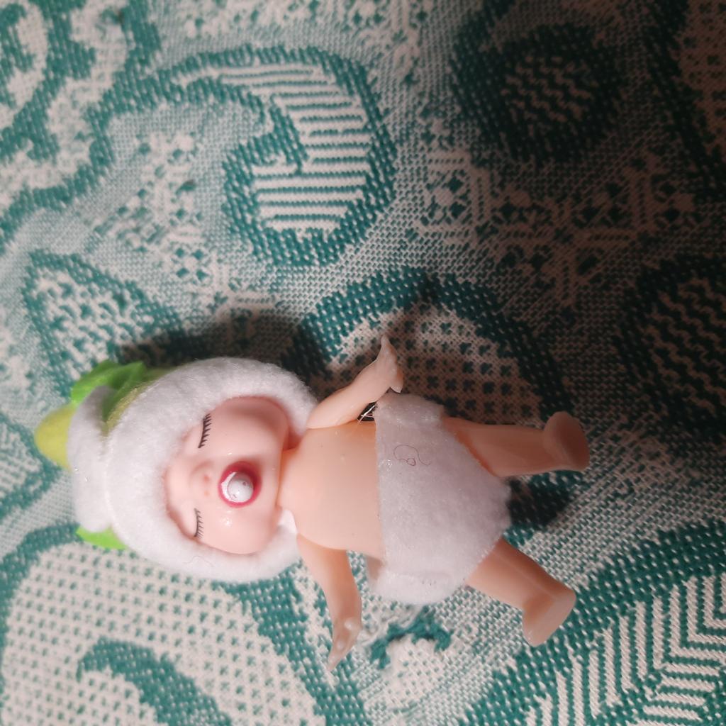 Cute little rubber doll in a green hat. Arms and legs move. The hat can be removed. Thank you for the item.