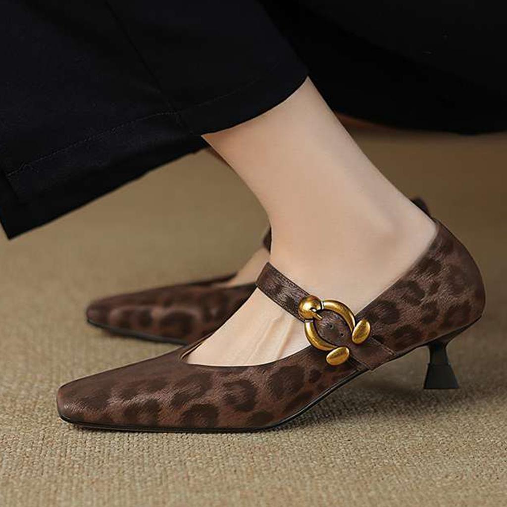 Krazing Pot Sheep Skin Summer Spring Autumn Stiletto Med Heels Leopard Women Square Toe Metal Decoration Shallow Pumps