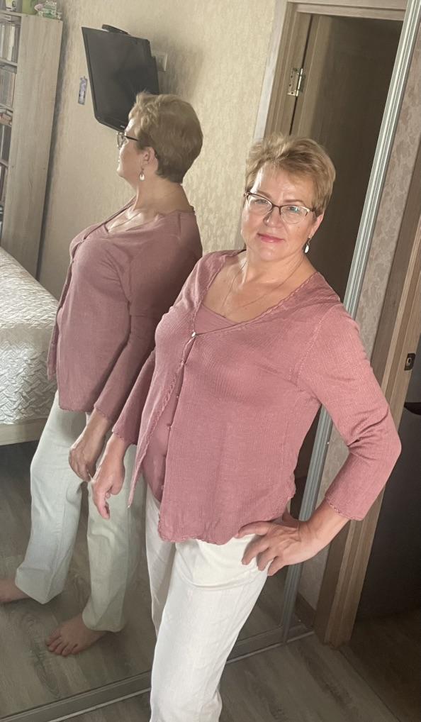 Good top, viscose, fits true to size, not tight on my 50-52, will order more in other colors, as it's rare to find a good top that fits well and doesn't feel like a sausage