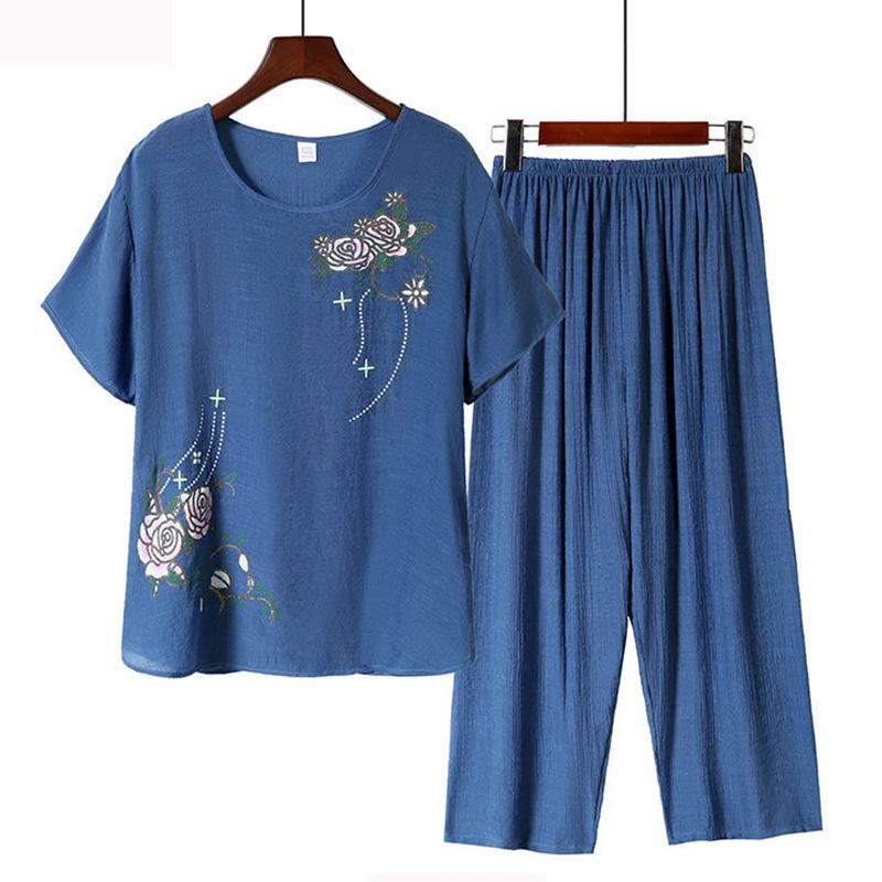 Women's Summer Thin Section Can Be Worn Outside Suit Middle-aged and Elderly Short-sleeved Comfortable Top + Seven Pants Casual Home Two-piece Set
