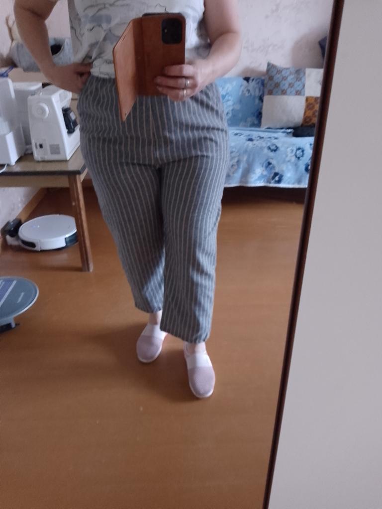 Small up, the side seam is not sewn in places, the trousers are very wide
