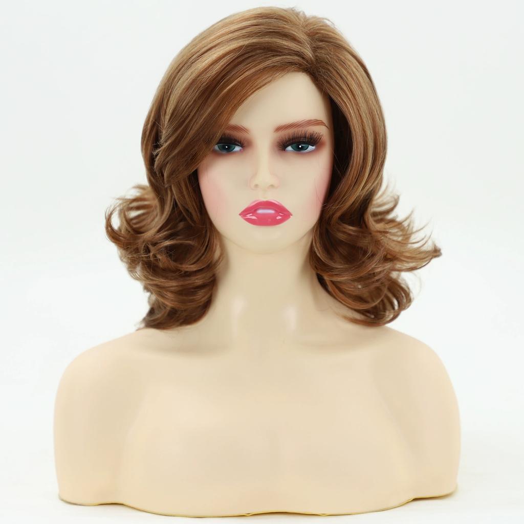 Women Shoulder Length Wave Hair Golden Brown Blonde Synthetic Wavy Wigs with Bangs Heat Resistant Fibre for Daily Cosplay Lolita