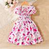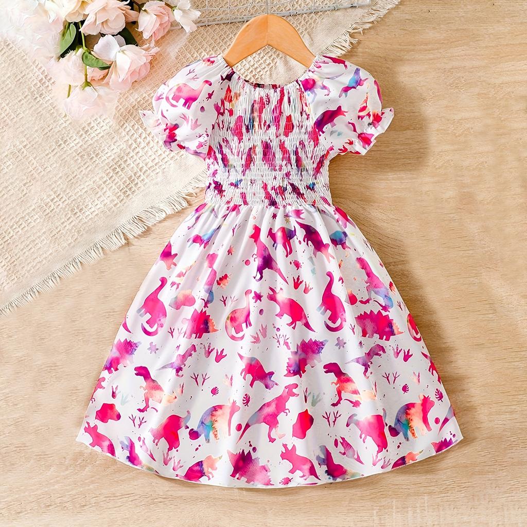 Girls' Waisted Cartoon Dinosaur Print Dress Summer Fashion Dress for Children