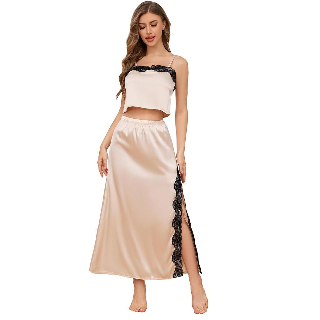 Women’s Pajamas Satin Lace Trim Strap Crop Top Slit Skirt Two-piece Set Sleeping Suits Lounge Casual Wear Style Night Sleep Dresses