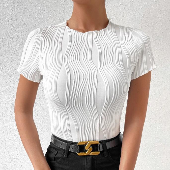 Spring and Summer New Round Neck Short Sleeve Solid Color Slim Fit Short Sleeve Irregular Vertical Stripes Ladies T-shirt