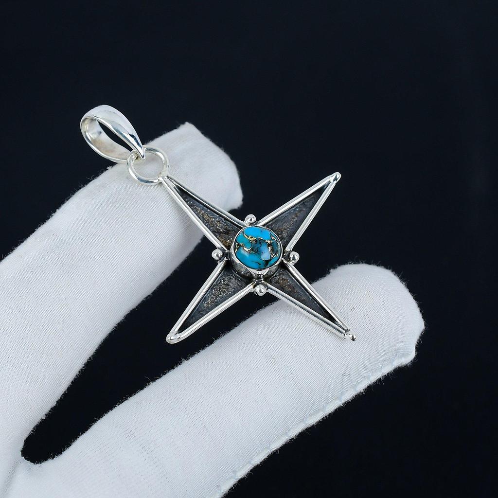 Blue Copper Turquoise Gemstone Silver Pendant In 925 Sterling Silver - Handmade Star Design, Everyday Wear Jewelry, Unique Designs Pendant Gift