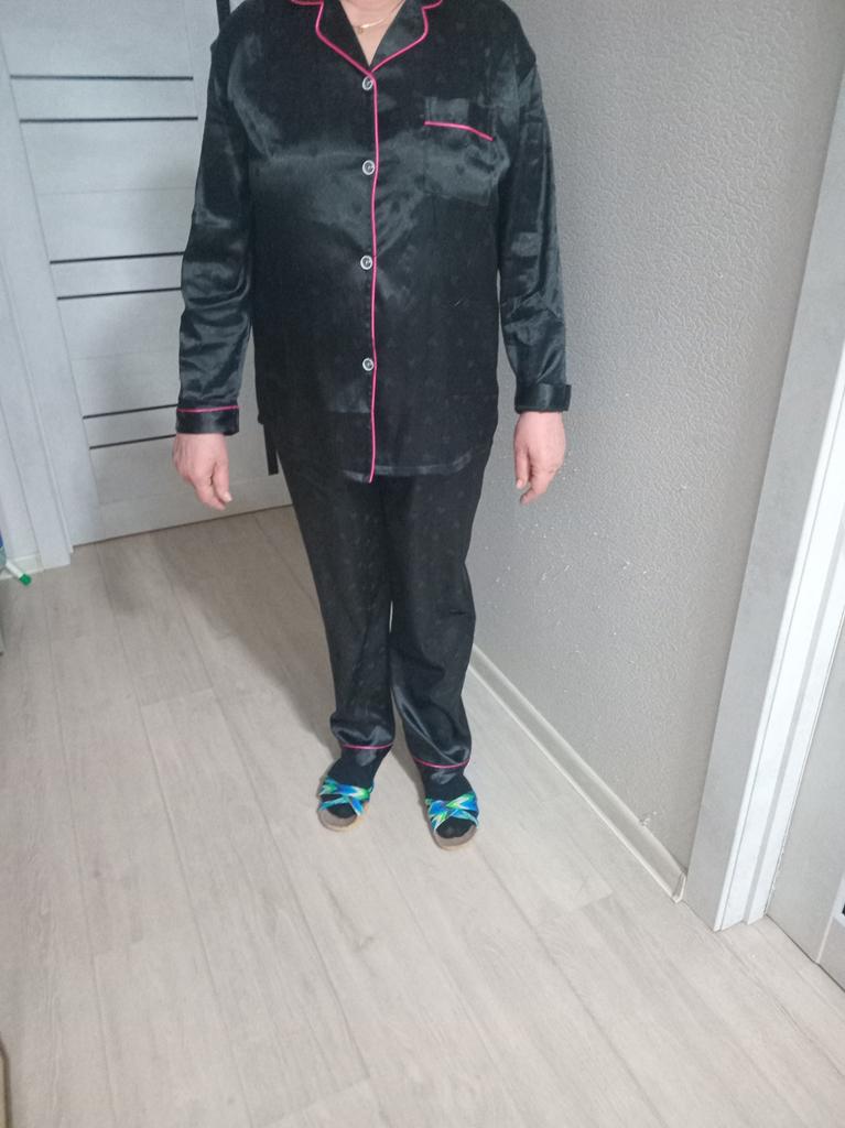 The pajamas fit size L (I wear 46-48), the fabric is pleasant in color and to the touch (polyester and 5% spandex). The quality is good, corresponds to the advertising photo on the website. I ordered on the website for the first time, I am satisfied with everything. Thank you!