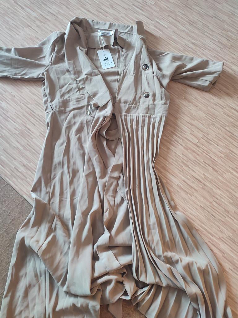 The fabric is very thin, you can see underwear. Size XL fit my 46. The dress is light, more for summer. It only stays on with the belt, if it's windy, you will see underwear. Looks cheap.