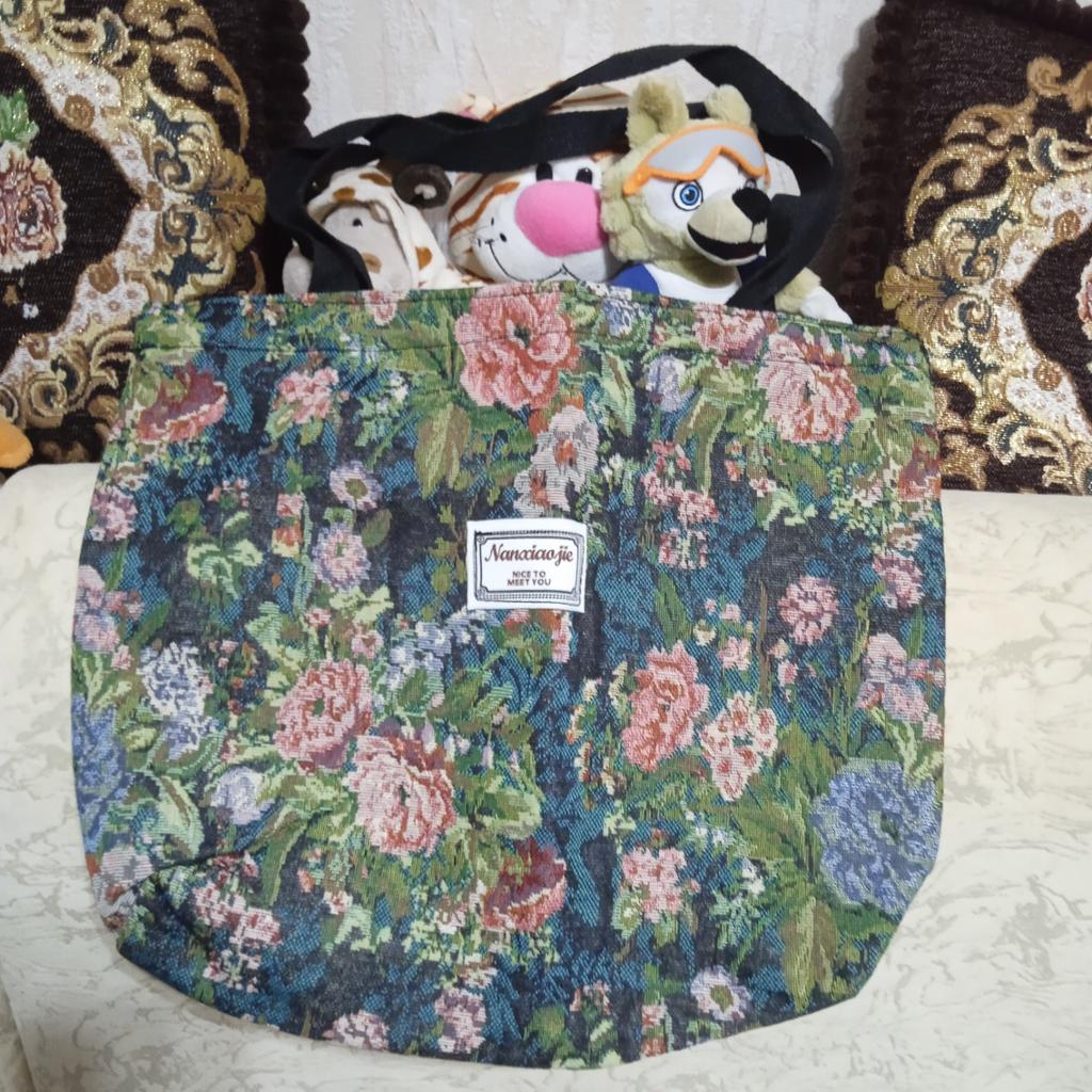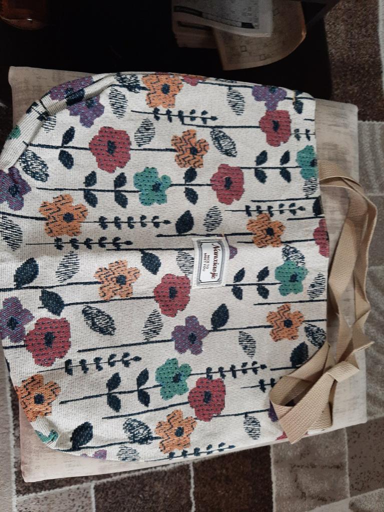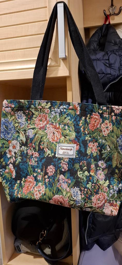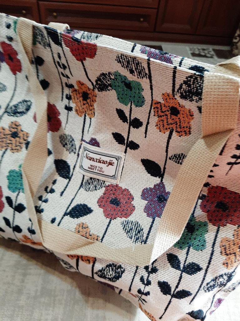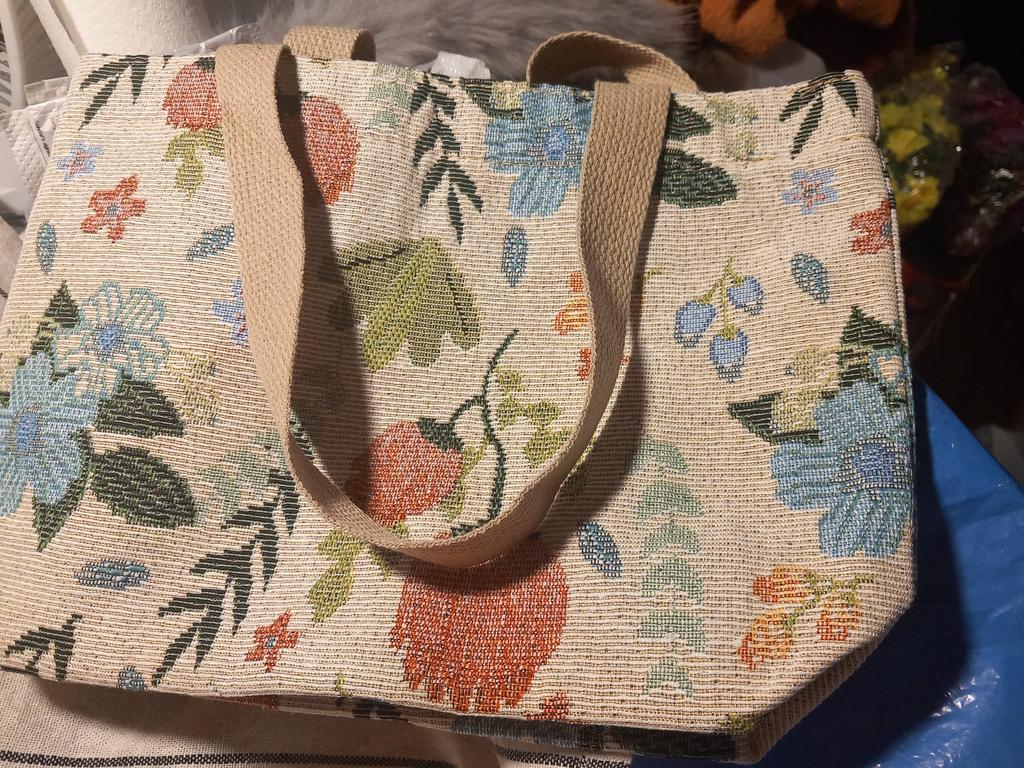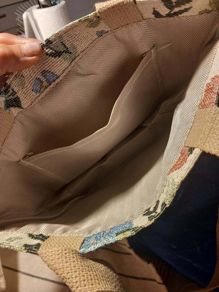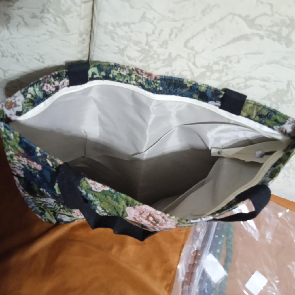 The bag is perfect for summer. The fabric is thick, similar to tapestry. The handles allow you to carry it on your shoulder. It closes with a zipper. There are no pockets inside.