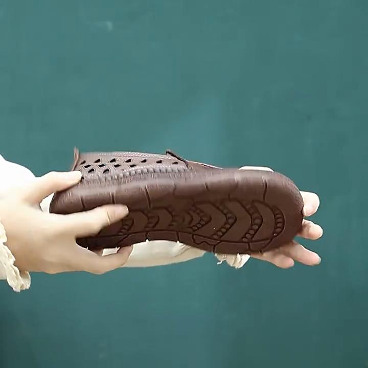 Johnature Hollow-out Breathable Flats Genuine Leather Comfortable Loafers Retro Versatile Women's Shoes