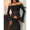 Autumn and Winter Elegant Women's Black Floral Mesh Strapless Flared Sleeve T-Shirt
