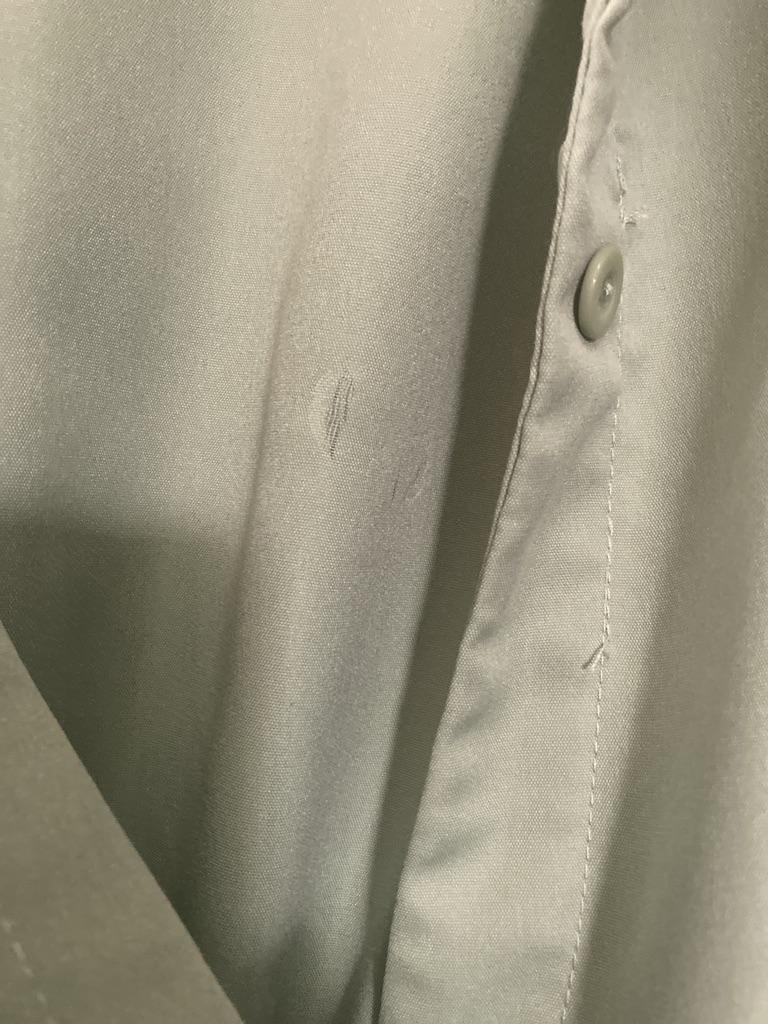 Not cotton. As usual, the buttons are sewn on unevenly