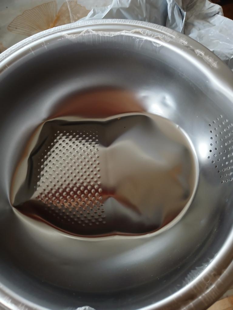 The bowl is all dented. Fingerprints remain on the metal. It arrived in film, which had to be peeled off, part of it remained along the edge. Threw it away.