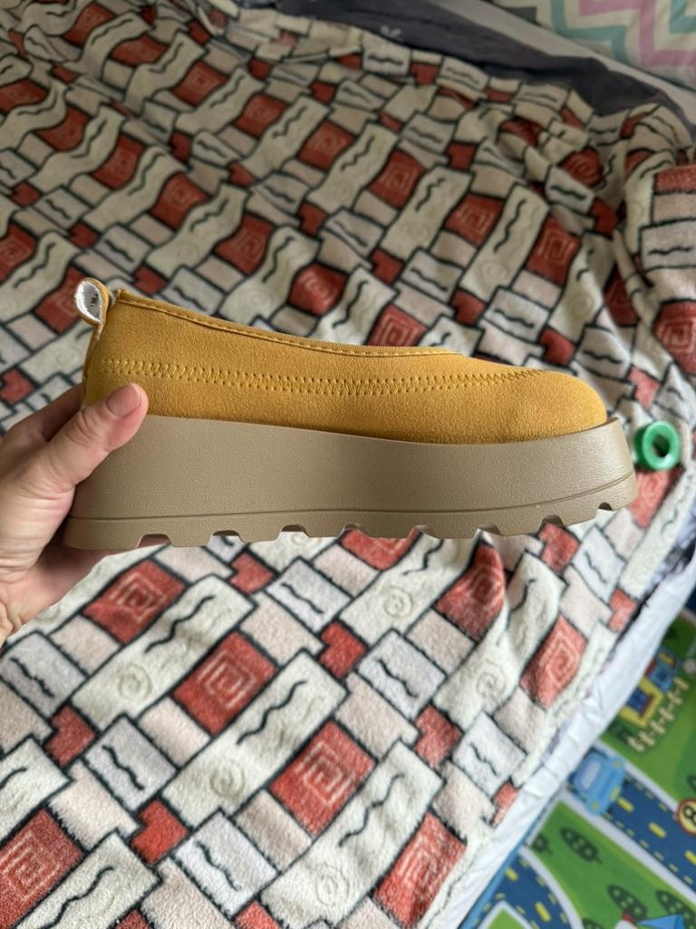 Size 39 fit my 38, but due to the square toe, the second toe presses a little. The material is artificial, but they look good, and my wide foot is comfortable and warm in them🤗