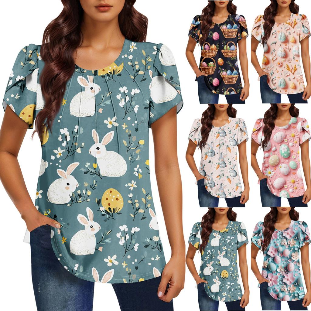Women's Fashionable Round Neck Short Sleeve Printed Casual Basic Pleated Pullover T-shirt Top