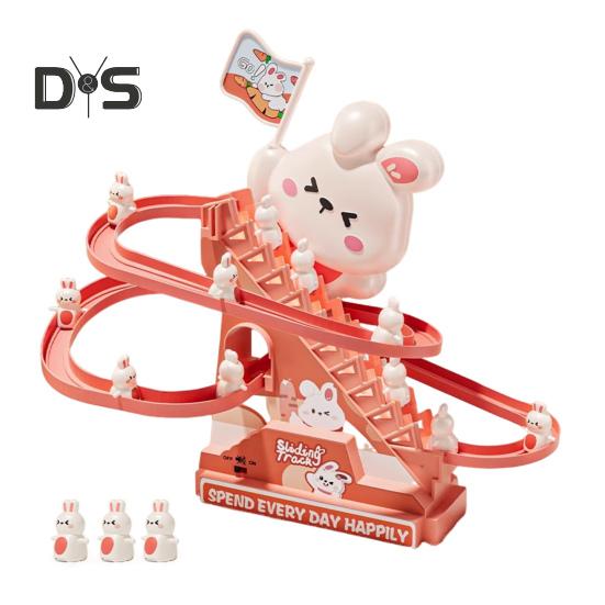 With LED lights and music, this toy provides sensory stimulation while enhancing fine motor skills through assembly. Watch as the rabbits/dinosaurs climb the stairs and slide along the track with a simple button turn.