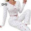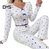 Women Lace Trim Pajama Set Long Sleeve V-Neck Front Button Tops Full-Length Pants Sleepwear Nightwear