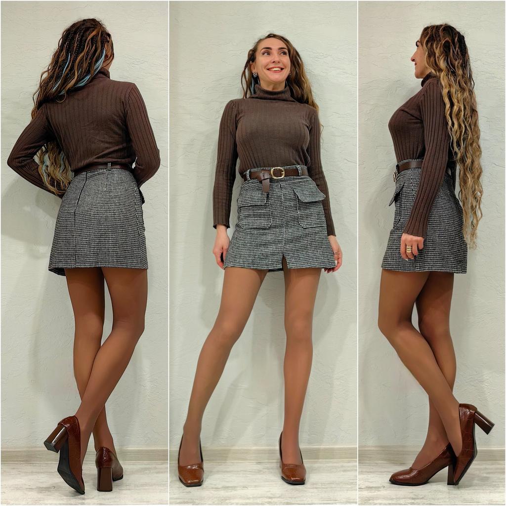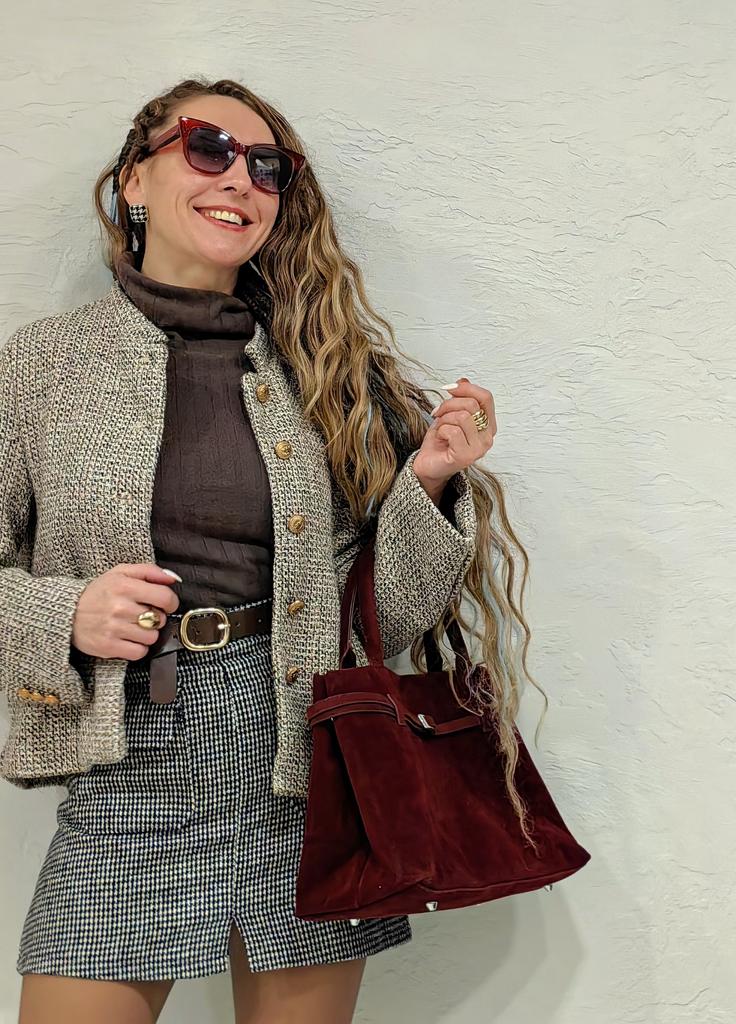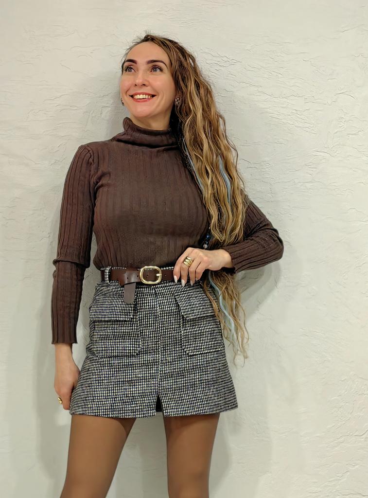 Plaid Wool Blend Belted Skirts High Waist Slim Houndstooth A-Line Skirt