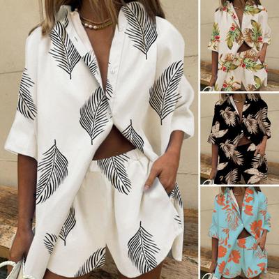 2 Pcs/Set Women Shirt Shorts Set Floral Print Loose Single-breasted Half Sleeve Lapel Pockets Elastic