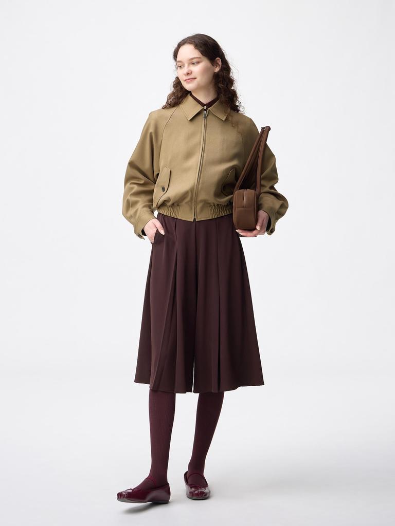 GU by Uniqlo Draped Culotte Q is a unique design that offers the ease of pants while providing the feel of a skirt. The flared silhouette adds elegance, while the soft and flowing drape material stands out. The front cross-tuck creates a three-dimensional silhouette.