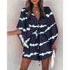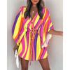 Summer Casual Drawstring Tie-Up Mini Loose Dress Fashion Print Batwing Sleeve Beach Dress Sexy Button V Neck Women Party Coverup