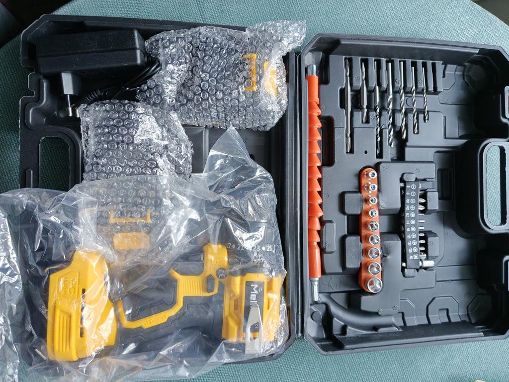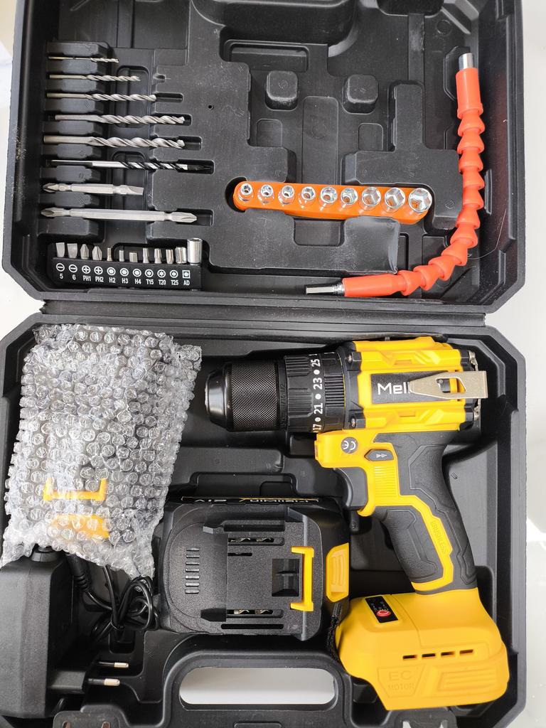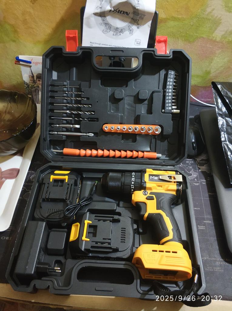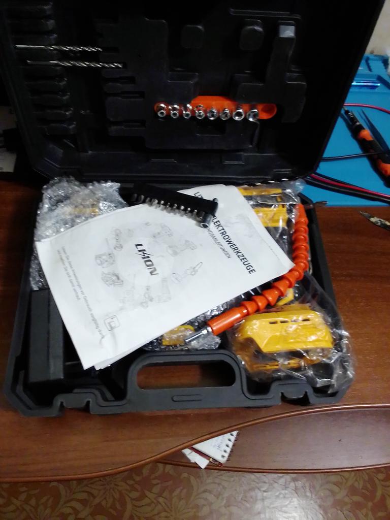 Everything arrived intact (the cardboard box took all the bumps of the journey). The drill (product) is miniature, lightweight, and the batteries are also not large in size. Designed for careful, gentle use. The set includes the necessary minimum of attachments. The charger rattles in the case as if it doesn't belong. There is one instruction for the entire line of tools of this brand. We will try it out in practice,