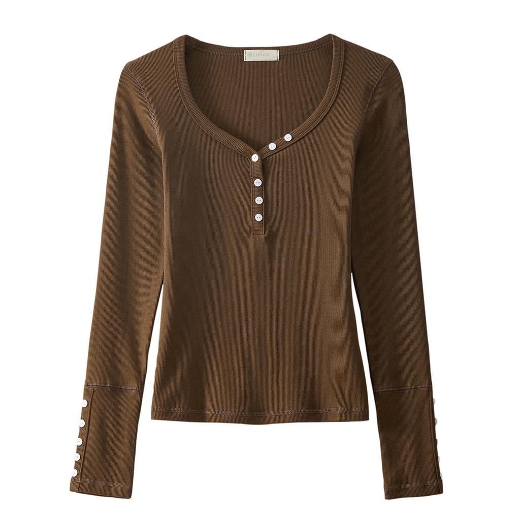 Button V-neck Long-sleeved T-shirt for Women's Pure Cotton Autumn New Style Front Shoulder Top Base Shirt