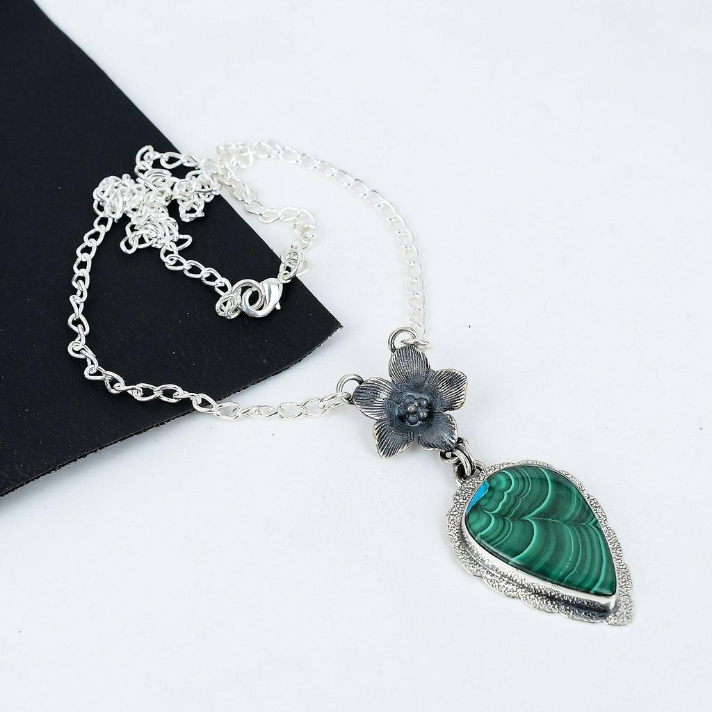 Natural Malachite Gemstone Handmade 925 Sterling Silver Electroform Flower Necklace, Malachite Silver For Wife Unisex Pendant Esater Gifts
