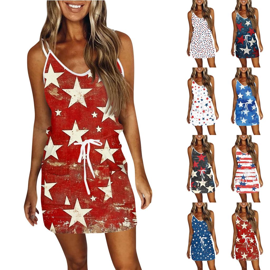 Women's Fashion Summer Independence Day Printed Loose Sleeveless Pocket V-Neck Dress