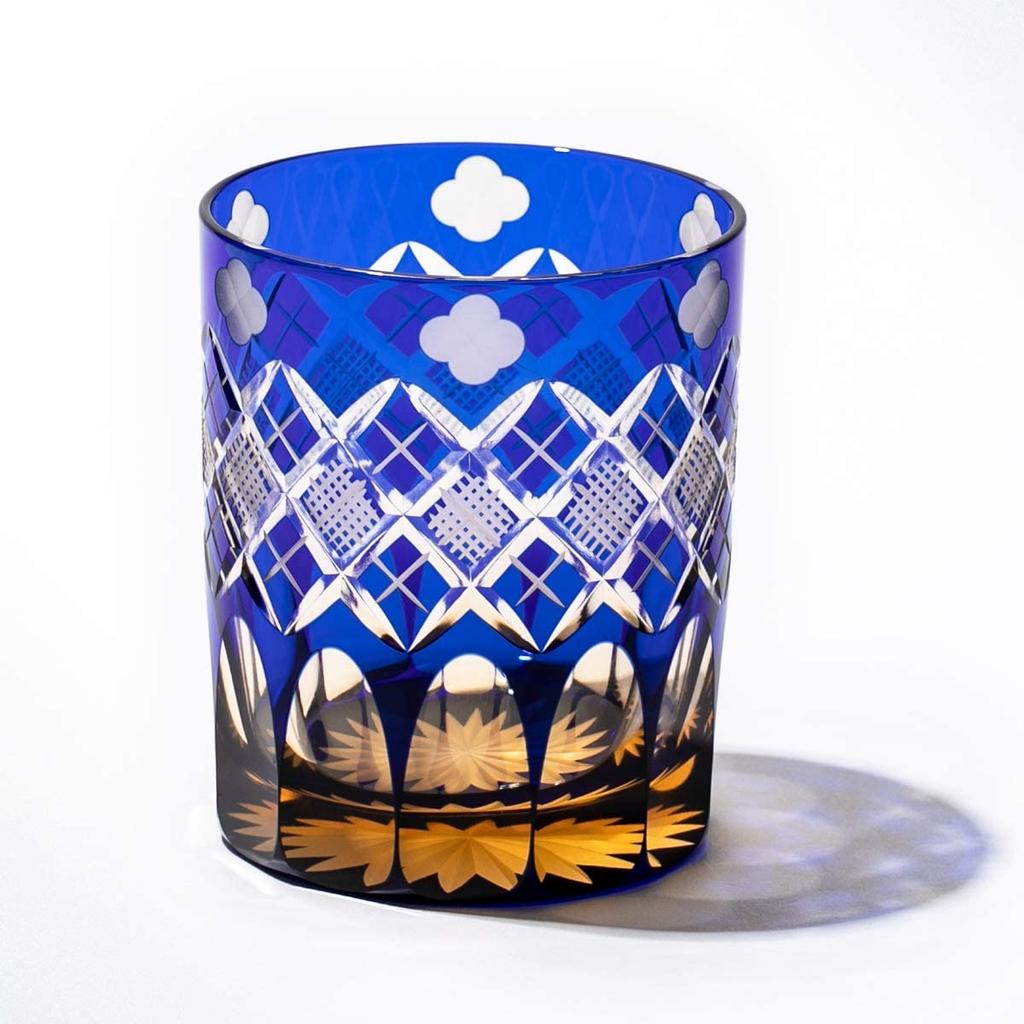 This warm piece uses amber color for the inner glass, allowing you to enjoy the contrast of the two colors. The mouth of the glass is decorated with a ``four-leaf crest'' representing the ``four-leaf clover,'' which is a symbol of good luck, love, sincerity, and hope. The base ``Yarai Nanako crest'' is also a traditional pattern that brings good luck. ``Yarai'' is a shape made of bamboo or logs arranged in an alternating manner, and it has the meaning of ``creating the basis of something'' or ``strengthening the foundation.'' ``Uoko'' refers to the scales of a fish, and because of its large number, it represents ``fertility'' and ``abundance.''