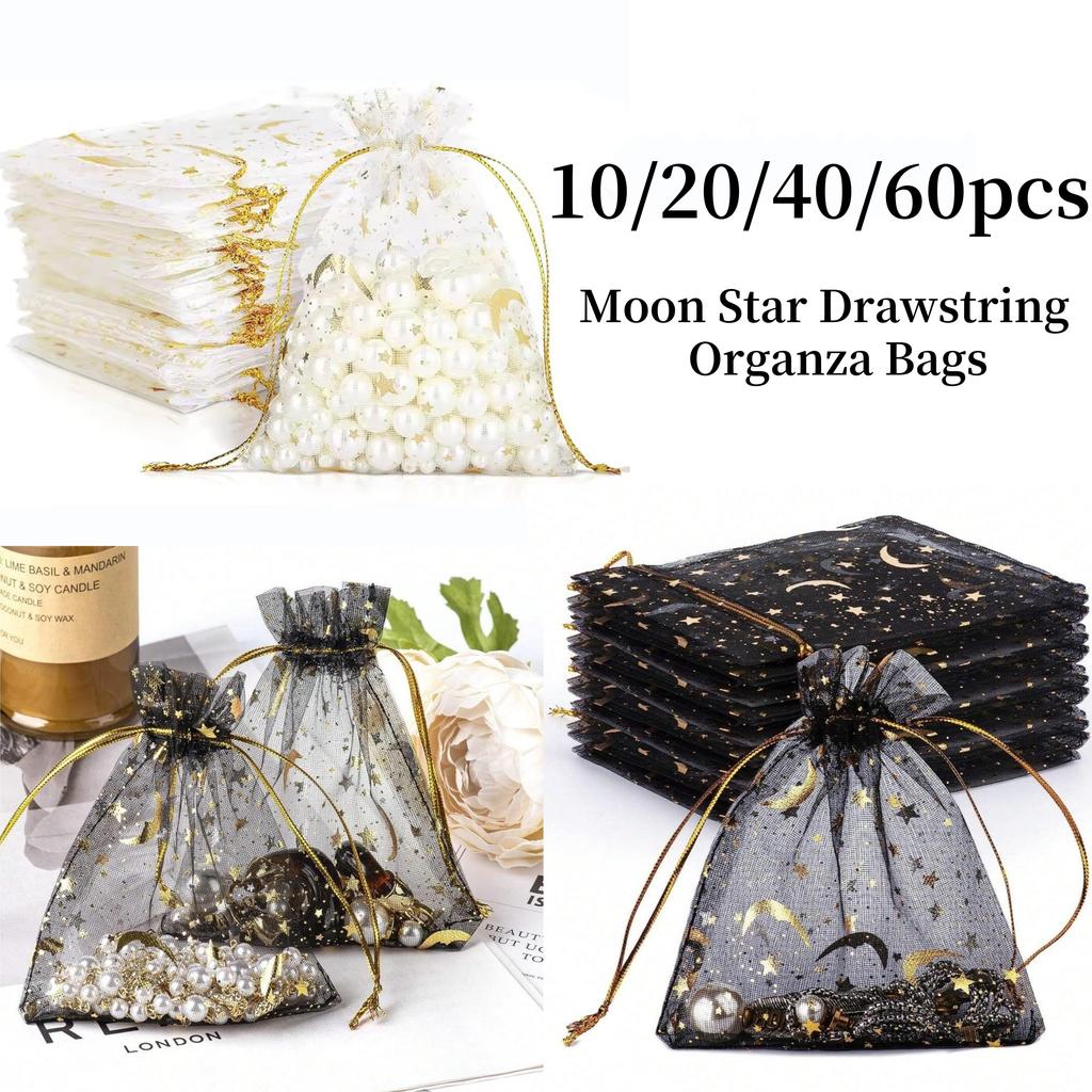 10/20/40/60Pcs Moon Stars Drawstring Organza Bags Candy Gift Package Bag Jewelry Organza Pouches Christmas Wedding Party Decor