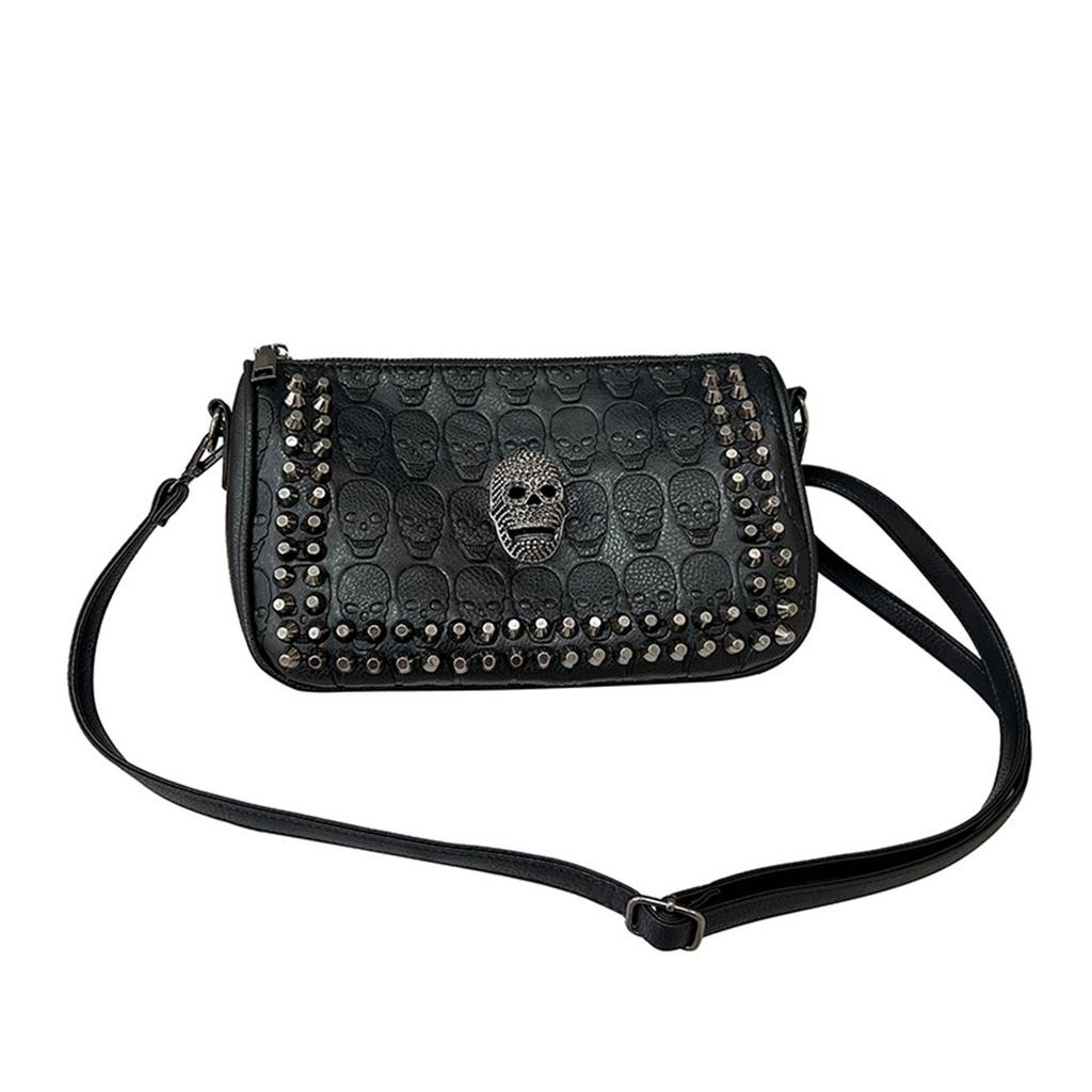 Shoulder Messenger Bag with Skull Design Black Studs Y2K Street Motorcycle Punk Wind Bag Halloween New